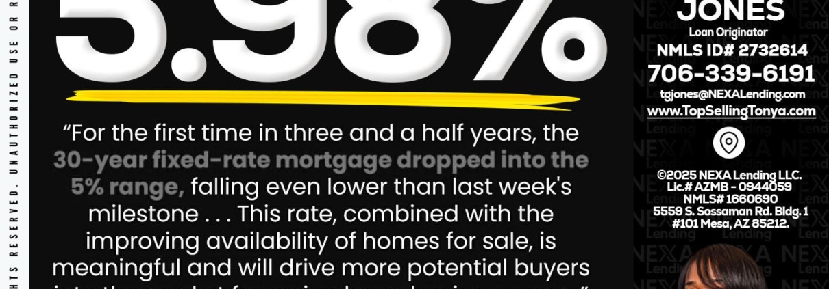 5.98% - Tonya Garmon Jones -Loan OriginatorHi, my name is Tonya Garmon Jones. I’m a Loan Officer with NEXA Lending LLC., offering personalized mortgage solutions, fast customized quotes, great rates and service with integrity.