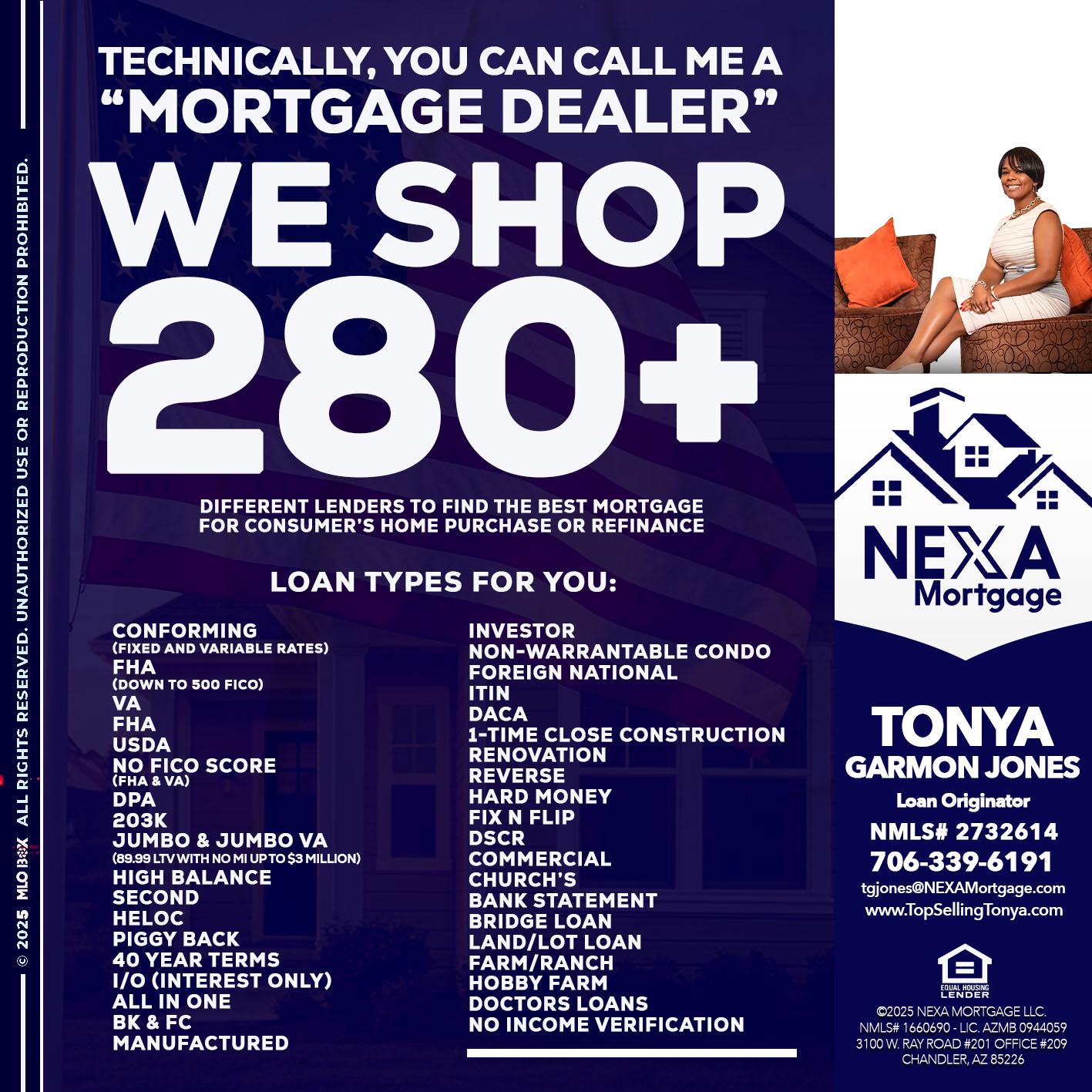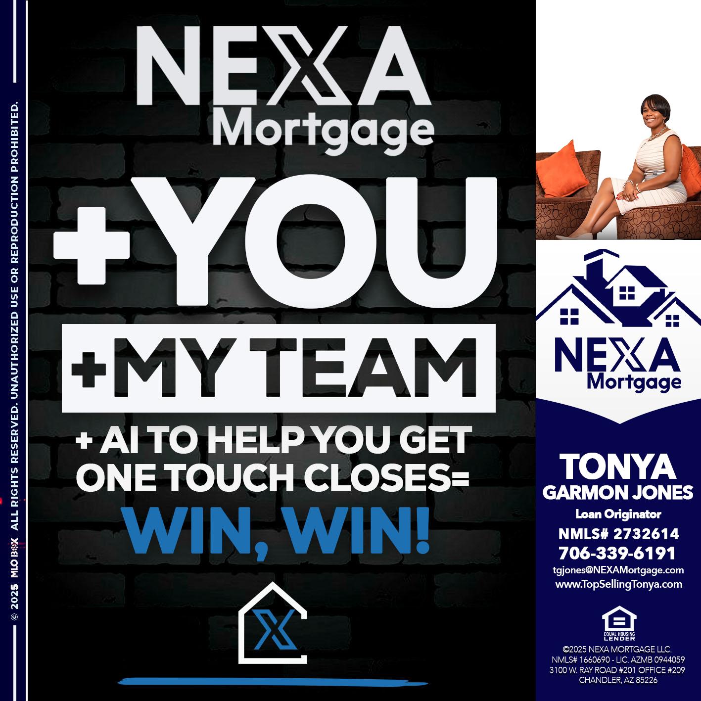 Hi, my name is Tonya Garmon Jones. Iβm a Loan Officer with NEXA Mortgage LLC., offering personalized mortgage solutions, fast customized quotes, great rates and service with integrity.