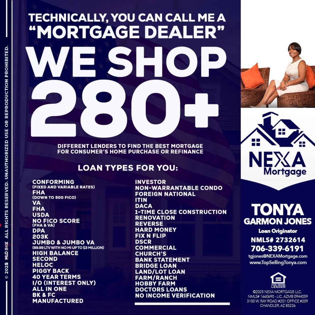 Hi, my name is Tonya Garmon Jones. I’m a Loan Officer with NEXA Mortgage LLC., offering personalized mortgage solutions, fast customized quotes, great rates and service with integrity.
