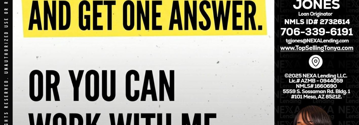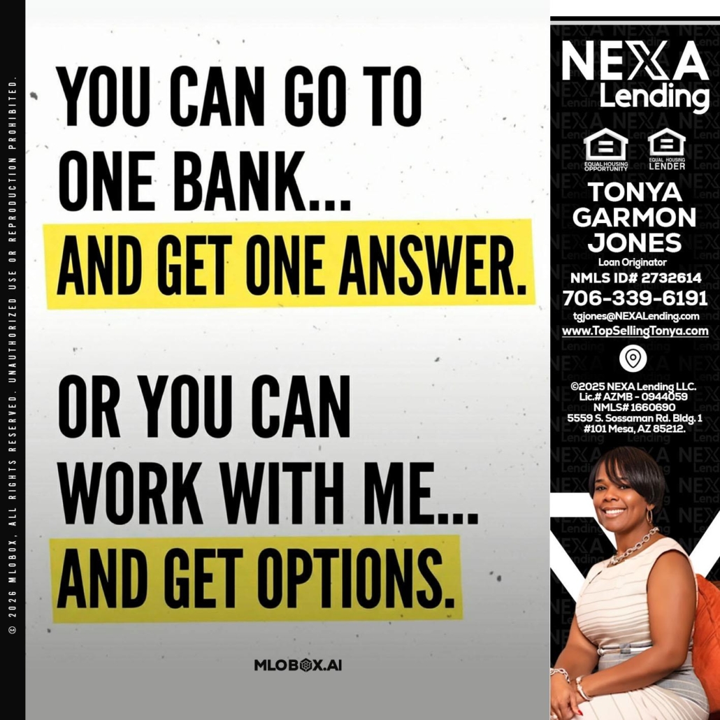 YOU CAN GO TO - Tonya Garmon Jones -Loan OriginatorHi, my name is Tonya Garmon Jones. I’m a Loan Officer with NEXA Lending LLC., offering personalized mortgage solutions, fast customized quotes, great rates and service with integrity.
